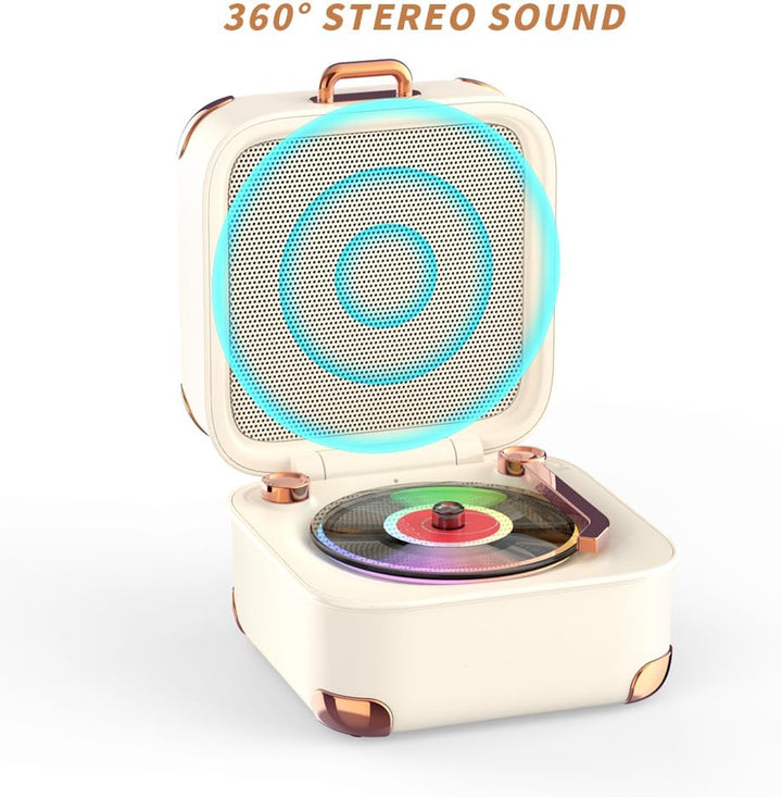 Vintage Aesthetics: The speaker features a charming retro design in a creamy beige finish with rose gold accents on the handle, corners, and tonearm. It mimics the look of a classic vinyl player.